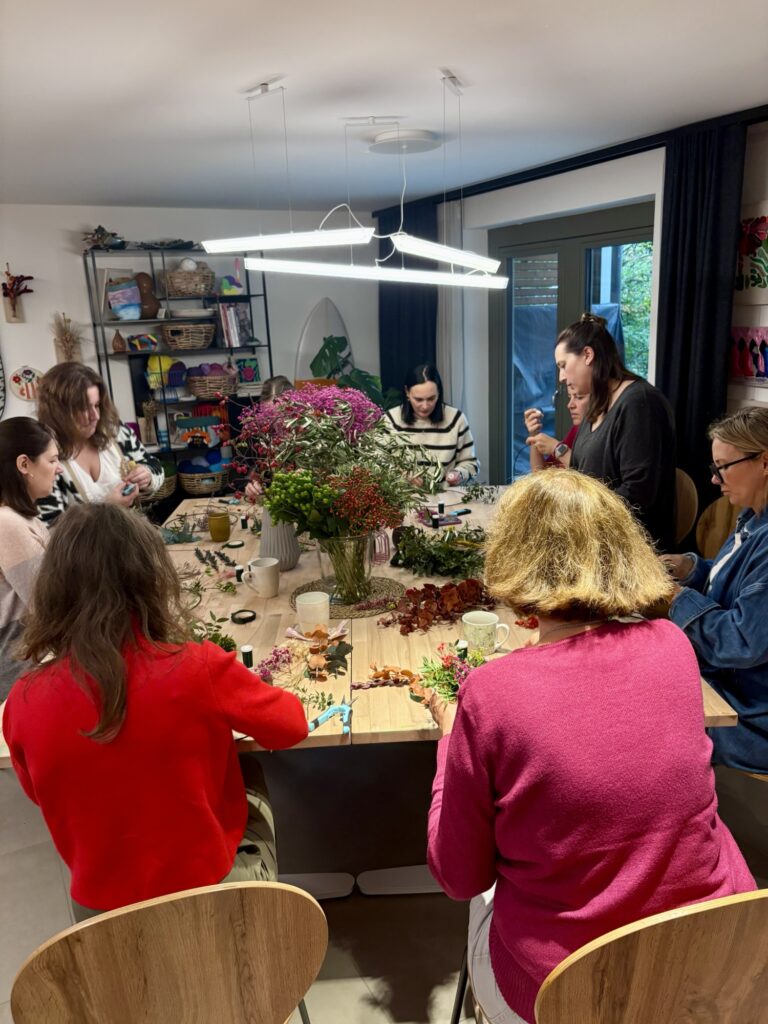 Dann wird es lebendig im Raum: hier das leise Rascheln von Blättern, dort ein Stück Draht, das festgezogen wird. Gespräche, Lachen und manchmal auch ganz konzentriertes Schweigen füllen die Luft. Ich gehe von Platz zu Platz, helfe, wenn eine Hand fehlt, gebe Tipps oder kleine Tricks weiter – aber der eigentliche Zauber liegt darin, dass man selbst den eigenen Rhythmus findet.