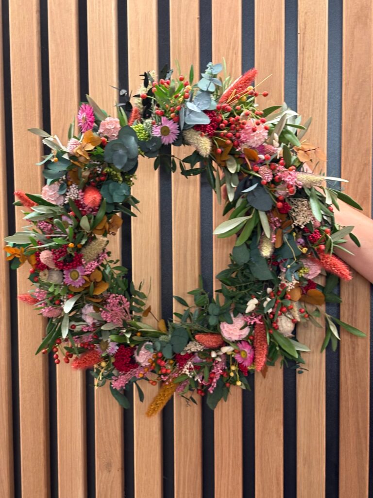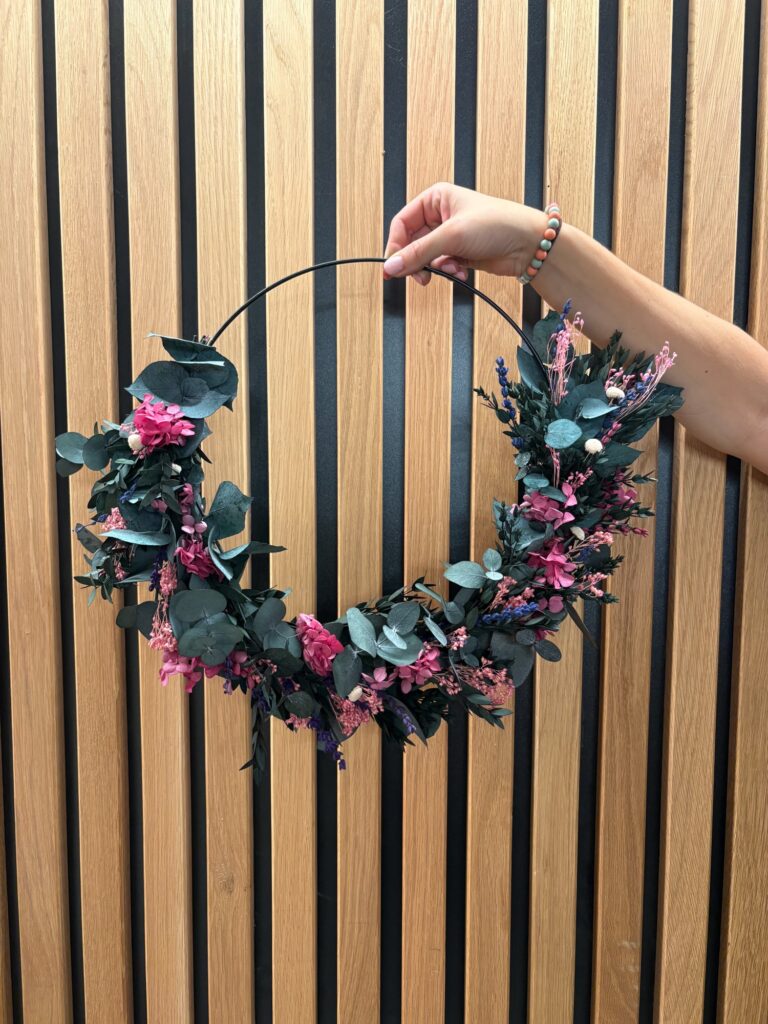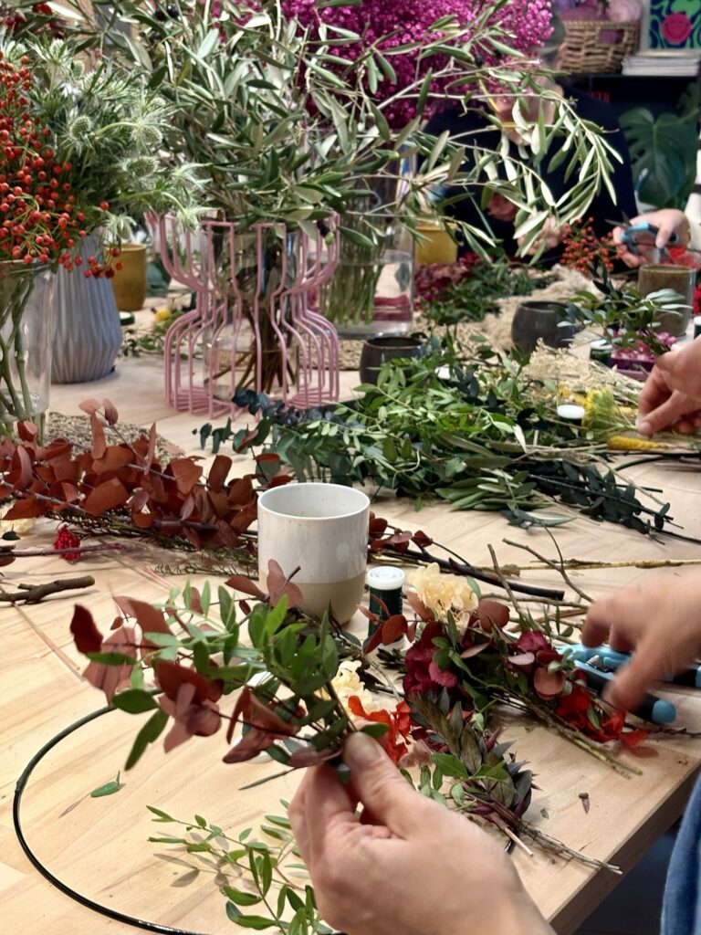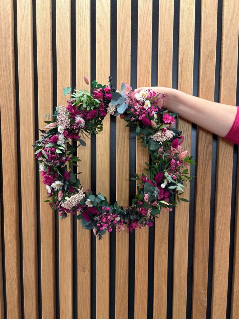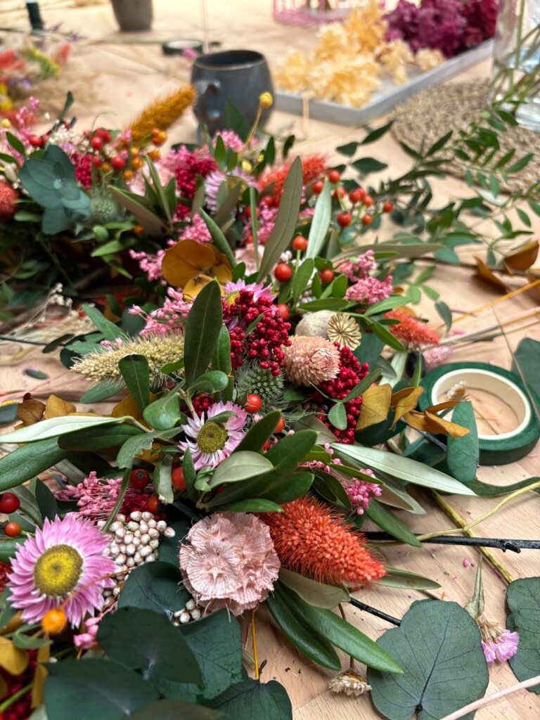 Nach und nach entstehen Kränze, die so unterschiedlich sind wie die Menschen, die sie binden. Manche bunt und üppig, andere schlicht und zurückhaltend, manche wild, manche zart. Und doch haben sie alle etwas gemeinsam: sie tragen die Freude des Moments in sich.