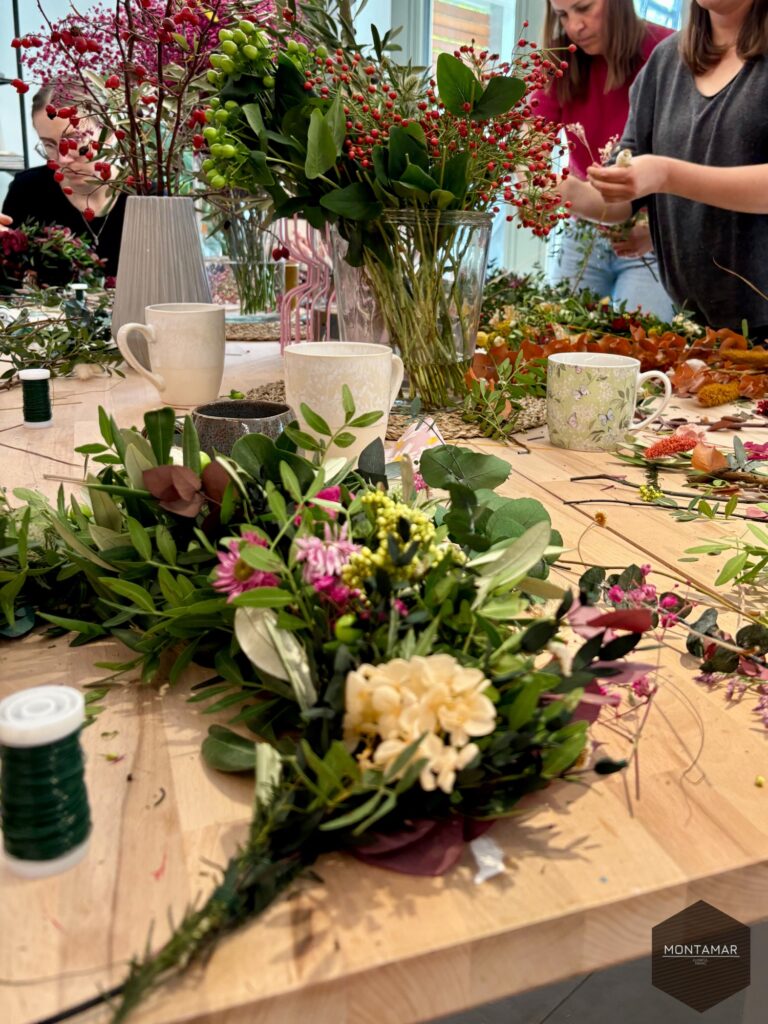 Die ersten Minuten sind immer voller Spannung. Manche Teilnehmende wissen sofort, welche Blumen und Farben sie in ihrem Kranz sehen wollen. Andere lassen den Blick schweifen, halten die Stiele in der Hand, überlegen noch – vielleicht ein bisschen unsicher. Doch genau das ist das Schöne: mit jedem Handgriff legt sich die Zurückhaltung, und nach kurzer Zeit sind alle mittendrin.